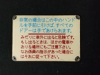 | 「非常の場合はこの中の ハンドルを手前に引けば すべてのドアーは 手であけられます。」 みだりに車外に出ると 危険です。他 アクリル板製 サイズ/8.5x12.5x0.2cm 裏彫文字 状態優 |