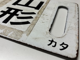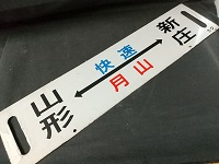 | 「快速月山 山形⇔新庄 /酒田⇔山形」 ホーロー板製 浮き文字 カタ テープ痕有 状態優 |
