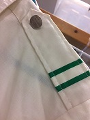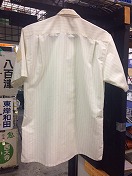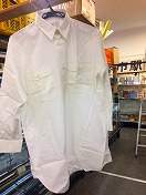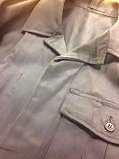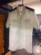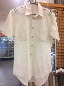 【盛夏シャツ2号】 接客半袖 肩章緑2本線入 肩幅 46cm 胸囲 108cm 着丈 80.5cm 繊維くず、 ポケット下部汚有 タグ有/状態良 |