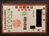 【優待乗車証】 近鉄 「鉄軌道線 名張井西各線」 通用期限:昭和63年10月31日限 状態 優 |