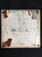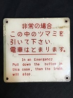「非常の場合 この中の ツマミを引いて下さい。 電車はとまります。」 下段は英語表記 裏彫文字 サイズ/10.2x10.7cm 厚さ0.2cm 裏面に接着剤痕有 状態優 |