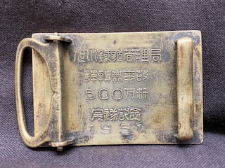 【ベルトバックル】 「A.R.O.D」 旭川鉄道管理局 運転無事故 500万粁 完遂記念 1951 3.7×5.5cm 状態 良/汚・ベルト通し部分歪み有 |