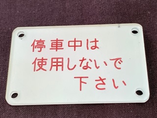 【車内プレート】 「停車中は・・・」 アクリル製 堀文字 4×6.3×0.2cm 状態 優 使用による傷有 |
