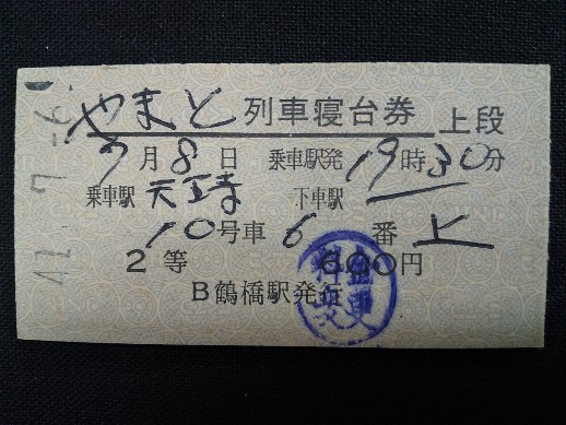 【硬券 列車寝台券】 やまと 昭和41年7月6日 天王寺駅から乗車 鶴橋駅発行 焼有 状態 優 |