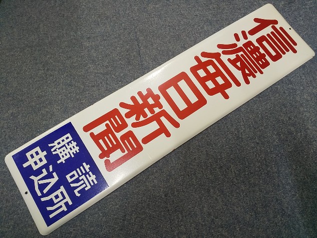 【看板】 信濃毎日新聞 購読申込所 鉄製塗装板 60×15cm 使用感少ない 状態 優 |