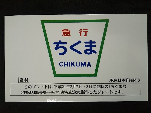 【記念愛称板】 急行ちくま 運転記念 平成21年 プラ板 24×14cm 状態 優 |