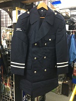 「東急バス」 紺色/サイズ3号 ダブルボタン 肩幅52/丈90/胸囲120 肩章付 右肩にワッペン付 両袖に銀線2本入 ボア襟(取外可)付 撮影のため開封 未使用 |