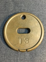 「第四種 楕円 13」 私鉄用 真鍮製 表面に 13 の刻印有 数字刻印有面のみ 縁取り有 上部に穴1つ有 下部にM字形切り込み有 使用による凹み傷等有 状態優 |