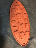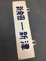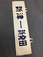 「新津⇔新発田 二ツ/ 新発田⇔新津 二ツ」 白色ホーロー板製/ 紺色彫文字仕上 吊りサボ 上部に吊り下げ用穴 2つあり 使用による細かな傷、 塗料剥げ・錆等有 状態優 |