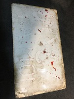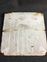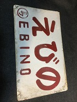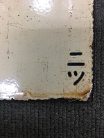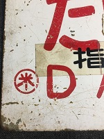 「えびの〇ミサ/無地」 白色ホーロー板製/ 赤色浮文字仕上 裏面に「かいもん」を 白色塗料にて 塗りつぶし痕有 全体的に若干、 反り曲がり有 使用による汚れ、細かな傷、 塗料剥げ、角部に 若干錆有 状態優 |