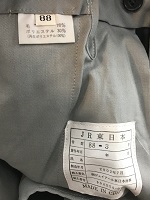 「JR東日本旧冬 接客上下」 色 ダークグレー サイズ/A5 肩幅46/丈72/胸囲100㎝ 両胸・両腰部に ポケット付 右胸と両袖にワッペン付 仕付糸・タグ付 ズボン サイズ/82 ウエスト82/また下72㎝ アジャスター付 |