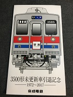 「3500形未更新車 引退記念」 京成電鉄 H29.2.26日付 厚紙製台紙付 サイズ/20.5/23㎝ 2つ折 D型硬券3枚 京成上野から260円/ 京成金町から260円/ ちはら台から480円 状態優 |