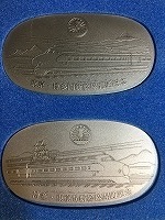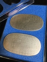 「東京・博多間新幹線 開通記念」 2枚セット デザイン 1.富士山/2お城 裏面/j時刻表と切符 1.東京→博多 ひかり21号 2.博多→東京ひかり100号 いずれも動輪マーク入 メダルサイズ/4x7x 厚さ0.1cm プラケース入 状態優 |