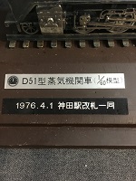 「D51型蒸気機関車 1/60模型」 車体/金属製 飾台/木製 レール/金属製 車体サイズ/ 7/31.5/5㎝ 飾台に1976.4.1 神田駅改札一同の テプラ貼付有 状態優 |