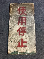 「ATS-S形/使用停止」 白色塗装板製/ 赤色手書文字仕上 サイズ/11.5/6㎝ 使用による汚れ、 塗料剥げ、錆、 受け枠痕等有 状態優 |