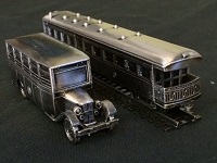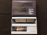 【記念品】 「東武日光線開通50周年」 金属製ディスプレイモデル 貴賓車トク500:1/130 T型フォードバス:1/100 車体裏面に刻印有 紙箱に傷み有 状態 優 |