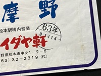 【駅弁掛け紙】 「特製幕の内/筑摩野」 調製:昭和63年9月14日14時 松本駅/イイダヤ軒 サイズ:26×19p 傷み・汚れ有 状態 良 |