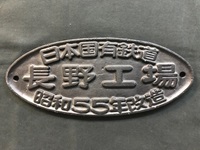 【楕円銘板】 「日本国有鉄道 長野工場 昭和55年改造」 鋳鉄製/黒色塗装 サイズ:26×11p 若干傷み有 状態 優 |