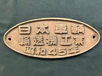 【楕円銘板】 「日本車輌/輸送機工業/ 昭和45年」 鋳鉄製/茶色塗装 サイズ:26×11p 若干塗装はがれ有 状態 優 |