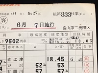 【運転士スタフ】 「富山第二機関区/第333仕業」 6月7日施行 9502:直江津→富山 スタフ1枚/表のみ 作成・照合印有 注意事項記載:14系客車 状態 優 |