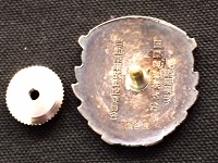 【記念襟章】 「二十年無事故章」 国際興業株式会社/ 自動車事故防止委員会 2.6×2.3p/ネジ式 刻印:純銀金張 箱付・裏面に錆有 状態 良 |