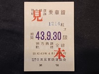 【乗車券】 「地方鉄道・軌道乗車券」 民鉄協 昭和22年5月3日 1214殿 期間49.9.30限 地方鉄道・軌道全線 昭和43年4月1日発行 社団法人 日本民営鉄道協会 第 號(空白) 裏面無地 状態 優 |