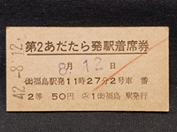 【着席券】 「急行あだたら」 第2あだたら発駅着席券 昭和42年8月12日 (北)福島駅発11時27分2号車 番 2等 50円 〇み1(北)福島駅発行 裏面注意書/状態 優 |
