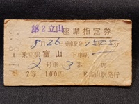 【座席指定券】 「第2立山」 昭和42年8月26日 乗車駅発15時05分 乗車駅富山 下車駅 - 2号車3番 席 2等100円 E富山駅発行 シワ有/状態 良 |