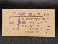 【寝台券】 「日本海」 昭和42年8月8日 乗車駅発21時20分 乗車駅京都 下車駅 - 3号車10番 2等1000円 E富山駅発行 状態 優 |