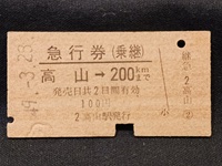 【急行券(乗継)】 「高山→200kmまで」 昭和49年3月23日 乗車駅発21時20分 発売日共2日間有効 100円 2高山駅発行 状態 優 |