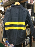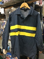 「国鉄雨合羽」 色 紺色+黄色ストライブ サイズ/1号 昭和58年度 肩幅48/丈78/胸囲115㎝ ビニール樹脂製 裏地付・タグ付 両胸にポケット付 中央部に黄色 ストライブ有 状態優 |