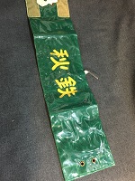 「秋鉄」 緑色布製/ 黄色印刷文字仕上 ビニール製カバー付/ サイズ/9/36㎝ 中央部上部に 安全ピン付/ 両脇に固定用穴 2つずつ有・ 紐付 両脇に マジックテープ有 状態優 |