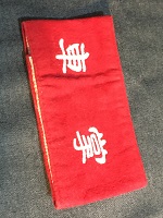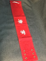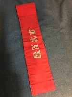 「乗客専務」 昭和61年3月 旭興産株式会社 朱色布製/ 白色印刷文字仕上 サイズ/7.5/41㎝ 左端部分に固定用穴 6つ・ 右端部分に固定用穴 2つ有 紐付 中央部上部に安全ピン 1つ有 状態優 |