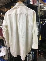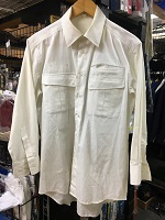 「京成現行シャツ」 色 アイボリーホワイト+ 白色ストライブ柄 サイズ/不明 長袖 肩幅48/丈80/胸囲105㎝ 両胸にポケット付 左胸はポケット2つ有 襟部分にシミ汚れ有 状態良 |