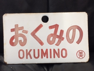 「おくみの」 越美南線の数少ない優等列車。昭和41年に急行運用で始まり、 急行のりくらと併結運用。もともと本数が少ないことも重なり ホーロー白板のものは数が少ない。これ以降はホーロー赤帯板 を飛び越えてプラ板に移行。 ○美/ホーロー白板赤浮文字/ホーロー剥、脱色有 状態使用痕共に極上 (純正品保証)(名古屋店) |