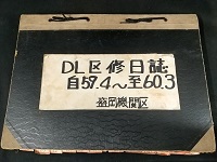 | 「DL区修日誌 盛岡機関区」 自59.4~至60.3 区修繕 月日、機号、不良状況、 検査箇所、加修方法、 加修検査担当者 DE10‐62,96,97,142,157,1001, 1110-14,1120,1130,1153,1160, 1183,1196,1197,1528,1594, 1595,1651,1747 DD51-561-570,668,678 DE15-1525,2505,2522 DD15-38 DD14-306,325 B4判 状態優 |