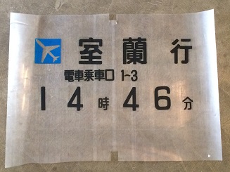 | 【ワンカット幕】 「改札案内用幕」 室蘭行 電車乗車口1〜3 14時46分 43.5×61cm ポリカーボネート製 状態 優 |