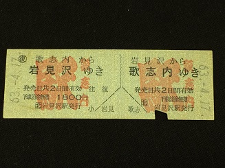 【硬券往復乗車券】 「岩見沢−歌志内」 63.4.17 歌志内駅影文字 JR地紋 状態 良 焼有 中央部折線に沿って折有 |