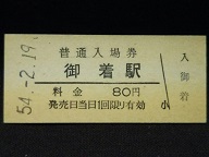 【硬券入場券】 「御着駅」 山陽本線 昭54.2.19 80円 発行駅記載無 状態 優/若干焼有 |