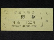 【硬券入場券】 「椿駅」 紀勢本線 昭57.8.10 120円 発行駅記載無 状態 優/裏破/若干焼有 |