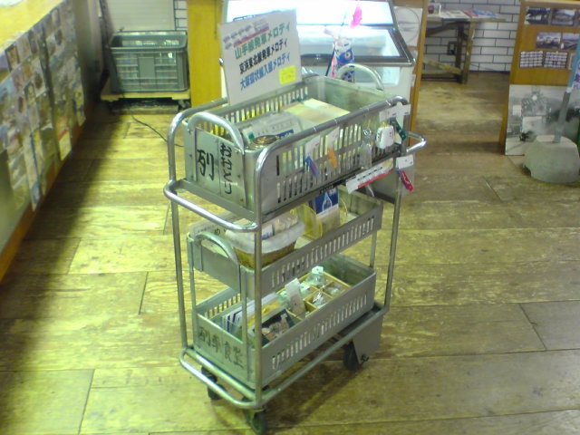 98号車にはどうかと思いますが これも立派な車輪がついています もうお分かりですね あの懐かしい「車内販売用」のワゴンです 定期運行の客車内での販売に使用予定です いかにもらしい物を満載で 楽しみながらやってみようと思います 冷凍みかんなんかもありましたね |