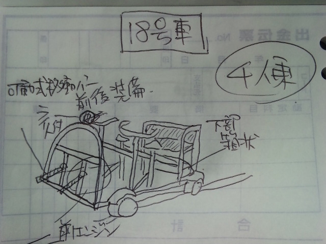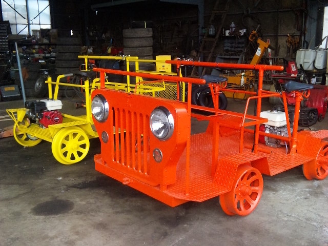 | 前方3名後方2名乗り 後方エンジン搭載リコイル始動 両側後方手動ブレーキ サイドブレーキ・三菱ホーン付・ヘッドライト2灯式 オルタネーター搭載・ジープ型トロッコ(朱色) 高出力の為リミッター装備 OTOGI WORKS改造 |