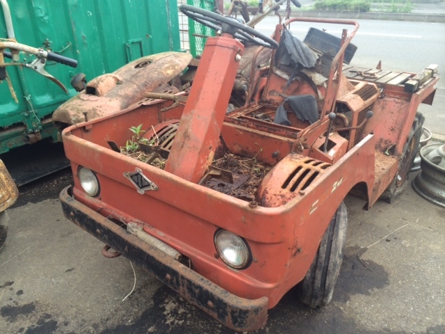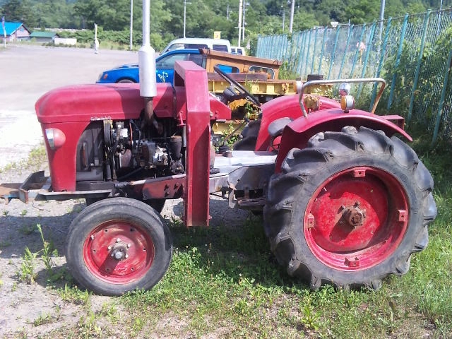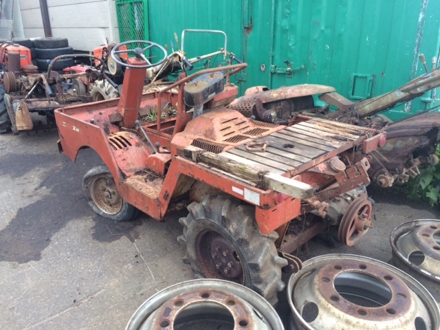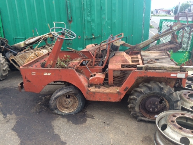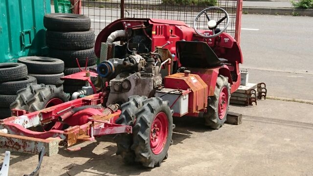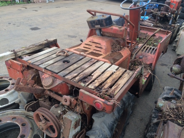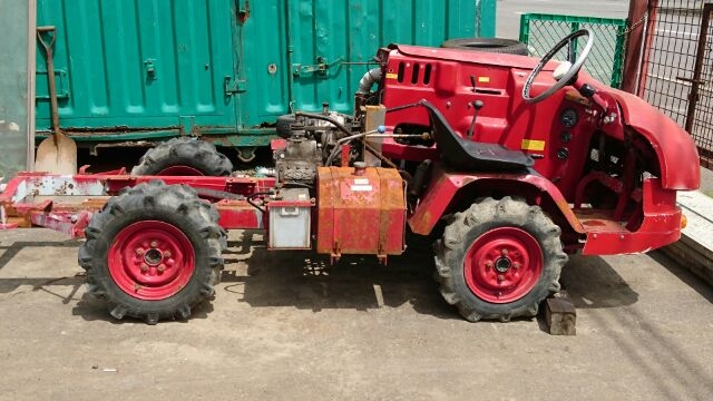 いったい何者群?の中でも理解に苦しむ戦士 その名も「ロケットスター」 後部からはロケットエンジンばりの火を噴いて かっ飛んで行く、大昔のフォーミュラ1のようでもある さぞかし早いかと言えば、時速はMAXで20キロぐらい イメージと違いのそのそと動く大トカゲ感のそれにも似て 表現が難しいが なんとも滑らかに地を這うようにどこへでも走る 隊長的には、このあとロールバーにフォグランブ類 後ろには発電機搭載の荷台をつけ 進路維持管理の為の各種武器を装備の予定だ 三菱製ディーゼルエンジン4発PTO装備 アルミハンドル・4WD 後ろブロックタイヤは組み合わせ式で6輪となるが 悪路用にドロ落し羽がついている オールドだが活躍期待大だ |
