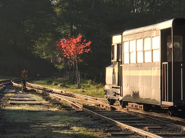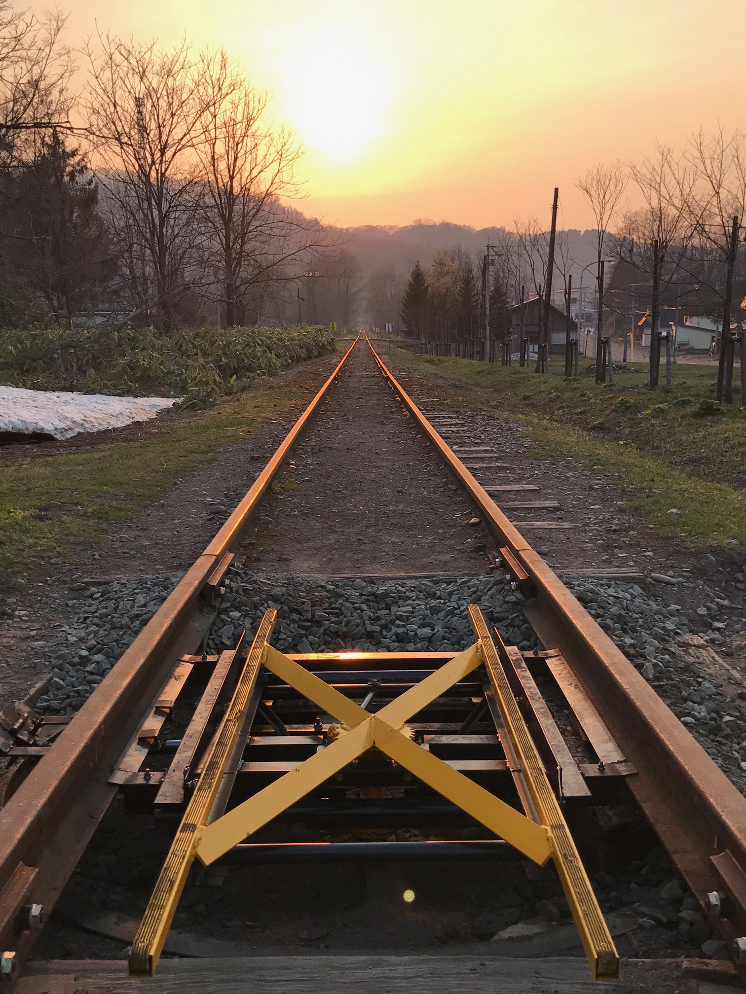 この夕陽を見に来ませんか? 体験運転トロッコ折返場に取り付けられた新型転車台 まっすぐに伸びた線路が真っ赤に染まる中、夕陽に向かって戻ります |