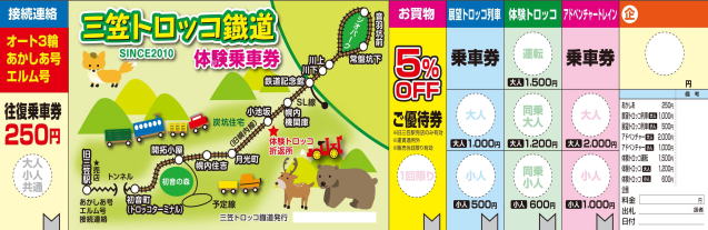 | 運営 | 運営は三笠市所有地内を使用した三笠振興開発株式会社並びに株式会社カラマツトレイン(本社札幌市)との 業務委託契約締結によるものとなっております ■カラマツトレイン三笠店 01267-2-6600 ■カラマツトレイン札幌本部 011-219-8033 ■駅員・車掌等サポーター募集中(男女)です現地事務所又は札幌本店まで