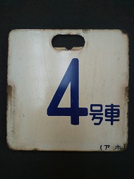 4号車○青/禁煙車4号車 ホーロー板・青浮文字 裏面シール貼 タテヨコ15p 状態優 |