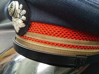制帽 「旧国鉄助役制帽 ・頭囲56.5p ・全体ラシャ布製 ・黒地 ・金帯1本 ・赤タグ有 ・氏名記入有 ・貸与:昭和41年2月 ・使用による布の 小さな傷穴有 |