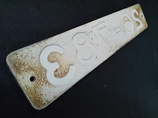 号車板 「7/17○札」 ・白地に黒の浮文字 ・15×15(耳含/ 18)p ・周囲/表面に汚れ、 錆、塗装の剥、 欠、有 |