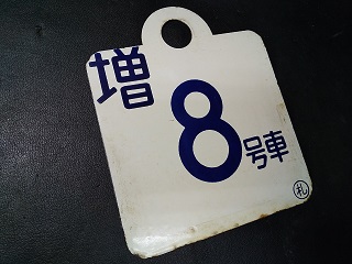 | 号車板 「増8号車」 ・ホーロー浮文字 ・15p四方(耳を除く) ・汚れは少ない ・周囲に傷み、欠け、 錆有 ・状態 優 ※同じ種類の在庫2枚あり |
