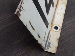 | 【種別板】 「急行・礼文-東室蘭 普通/急行・東室蘭- 豊浦 普通 ○手」」 ホーロー白板 赤浮文字 紺帯/白浮文字 汚、欠、剥、錆有 使用感有 状態 優 |